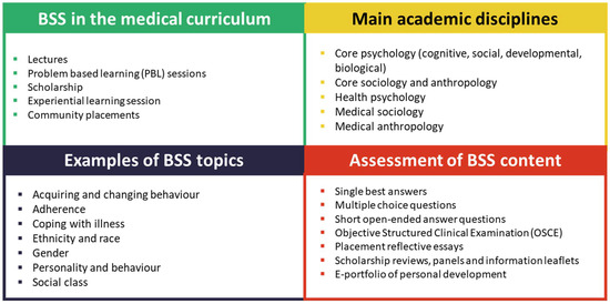 Despite the recognition of BSS, also called social and behavioural sciences (SBS), as a core component of medical education, its importance is not always perceived as being as useful or relevant as that of biomedical and clinical learning content [16]. Across UK medical schools, there are stark differences between how BSS is taught and assessed, as BSS educators often feel isolated, and medical students often perceive BSS learning content very differently to biomedical content [13,17,18,19]. This is the case in medical schools in other countries too; for instance, in Israel [20], in the Republic of Ireland [21], and in the US [22].