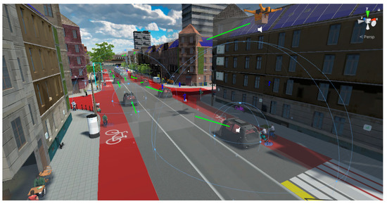 Figure 2 shows a section of an animated VR landscape created with the Unity game engine. Spheres around animated objects (moving cars) indicate the range of the spatialized sound representation in 3D. The closer the user (as a virtual avatar) moves to the emitting source, the higher the sound intensity (volume). In an urban traffic situation, this creates an acoustic impression over and above the dominant visual dimension. This can additionally strengthen a spatial sense of immersion.