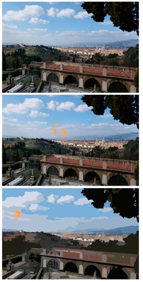The extension of Landscape 1, 2, and 3 by the dimensions V and A means, first of all, an increase in contingency, since new forms of construction, beyond the traditional material ones, are added. This means that the construction of landscape becomes (potentially) more diverse, which expands the research object of landscape research. Dimensions V and A in particular can be specifically incorporated into research on the individual and social construction of landscape. To illustrate this with Figure 4: The possible changes of Landscape M1 are—as explained above—subject to legal restrictions, for example, but also restrictions that are rooted in the inherent laws of World 1 (such as gravity, the upper image in Figure 4). This Landscape M1 can be enriched with elements that do not have to obey these laws (in Landscape A1; middle picture in Figure 4). Instead of hot air balloons, trees could also find their way in. This possibility increases the contingent construction in landscape in the same way as the complete creation of a virtual Landscape V1. This is not bound to the laws of Landscape M1 and is able to sound out the border area of what may still be called landscape and what is already no longer.