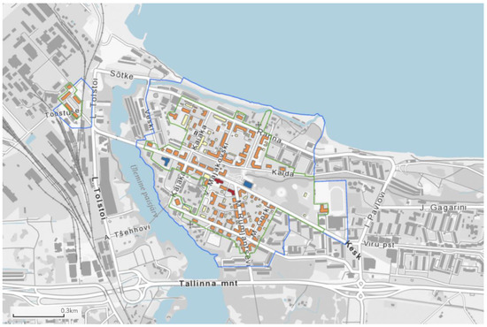 Proposed borders (green line marks the conservation area and blue line marks the protected zone), buildings (red, orange, and yellow designate different categories of protection), and cultural monuments (dark blue) of the Sillamäe Heritage Conservation Area. Estonian Heritage Conservation Board, 2022.