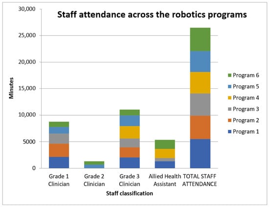 The set-up costs for the education included the staff costs for the provision of the education as well as the staff costs for receipt of the education (Table 4). This represents that total education required for the six × 6-week programs over four blocks (24 weeks). The total cost of education was AUD 4419, and this can be distributed across the six × 6-week programs for a cost of AUD 737 per 6-week program. It is likely that the cost of education per program would reduce over time, as it is assumed that the preparation time for the education material and the number of new staff requiring education on an ongoing basis would be less than that required for the initial six × 6-week programs. The cost of space for the RBT program is AUD 8.49 per day. Each RBT program requires 18 half days (AUD 8.49 × 18 days × 1/2 day) for a total space cost of AUD 76.41 per program.