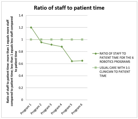 A recent systematic review of robotics rehabilitation economic evaluations identified five studies of moderate methodological quality []. Interventions spanned the acute, subacute and chronic stages of rehabilitation following a stroke, and all included upper limb rehabilitation, with one including both upper and lower limb rehabilitation []. The results indicate that for the robotics intervention groups, while the cost was generally less (four of the five included studies), both groups achieved that same health benefit (four of the five included studies) []. This finding is consistent with the current study, where—after program establishment—there was a lesser cost per patient in the robotics group, whilst the same health benefit was achieved. It is noted that this explorative economic evaluation only includes upper limb robotics. A recent systematic review of lower limb (or gait) robotics, combined with traditional physiotherapy and body weight support treadmill practice, was also found to be an efficient mode of therapy delivery after stroke [].