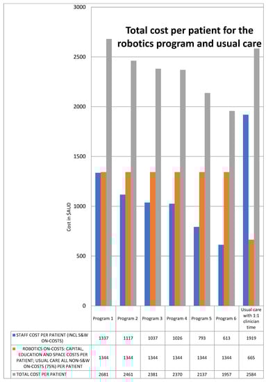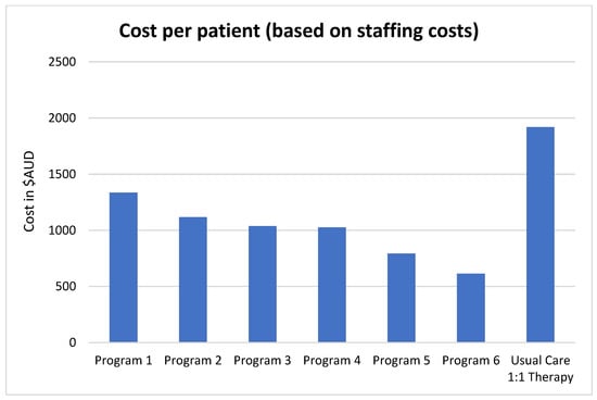 Per patient, the total cost of the RBT program ranged from AUD 2681 to AUD 1957; with each subsequent RBT program, the total cost per patient reduced (Figure 4). Per patient, the total cost of usual care 1:1 out-patient rehabilitation was AUD 2584 (Figure 4). Excluding the first of the RBT programs (Program 1), the cost of usual care 1:1 out-patient rehabilitation was consistently higher for the health service.
