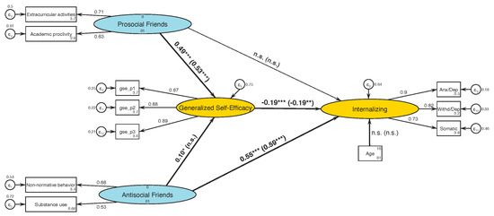Structural Equation Model. Final structural equation model representing effects of prosocial and antisocial friends and generalized self-efficacy on past 6 months youth self-report of internalizing problems among 1545 Ukrainian schoolchildren aged 11–13 years. Ellipses represent latent constructs. The paths are shown as straight lines and the values along the lines are standardized path coefficients significant at n.s. = “non-significant”, * p < 0.05, ** p < 0.01, *** p < 0.001 for girls (first values) and boys (parenthesized values).