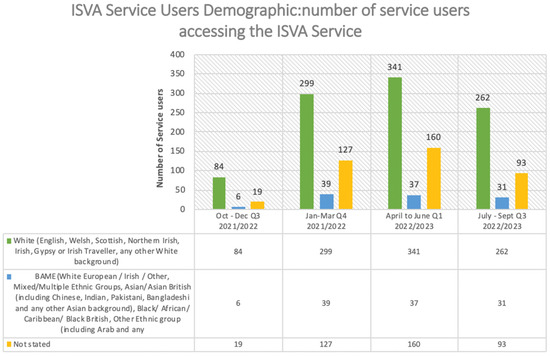 Although the number of BME service users was low compared with their White British counterparts, the progress and increase are noteworthy, considering the barriers mentioned above experienced by this demographic. It is essential to consider that the number of those in the “not stated” category was huge in all the quarters. Although not accounted for, one can infer that BME clients are also within these numbers. Nevertheless, it is safe to conclude that the establishment of the BME ISVA service translated into an increased number of disclosures and, in turn, service users from that community.