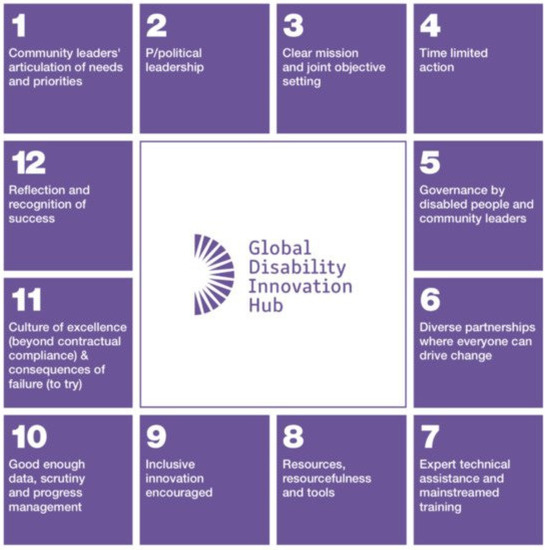 Both approaches identify the normative nature of framing, and neither is without controversy nor challenge. Identifying an operational approach to delivery with similar complexity toward a disability inclusion aim is challenging. For another study, we mapped the London 2012 Disability Inclusion approach, using a Delphi methodology with expert testimony [23] as an example, and found 12 steps of the operational activity necessary to deliver the complex intervention, as shown in Figure 1. This is helpful to consider as context. We shall discuss later in the paper what it reveals about the potential gaps that the AT sector could seek to address.