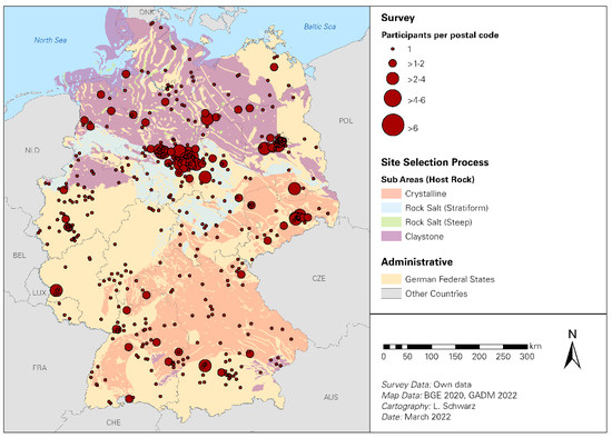 The question of how the statistical population is constituted is challenging: Germany has ~84 million inhabitants at the moment. A total of 54% of the country’s area are designated as sub-areas. Nonetheless, it is not a question for the inhabitants of those 54% only, as the repository shall host all the HLW from Germany (before 1990: East and West Germany). As Taebi [57] has vividly compared, the time scales of a repository potentially transcend the time scales of national states. She shows how the Slovenian capital Ljubljana has lain in seven different countries over the last century, thus raising the question if a repository can be regarded as a national matter only. The survey population could therefore also be multinational, if not even global.
