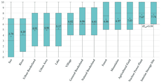 For the spatial assessment (SA, Figure 2) sites that fall within retributory argumentations, such as (in)active nuclear power plants or interim storage sites are perceived as most just (Ø = 7.67/7.74). In contrast to this, the sea (Ø = 3.78, SD = 3.46), rivers (Ø = 4.20, SD = 3.41), urban borderlands (Ø = 4.81, SD = 3.29), and urban areas in general (Ø = 4.86, SD = 3.35) are perceived as the least just sites. Interestingly though, no site has been fully disapproved, as the lowest average score ranks at Ø = 3.78 and no site has been fully approved, as the highest average score ranks at Ø = 7.74.