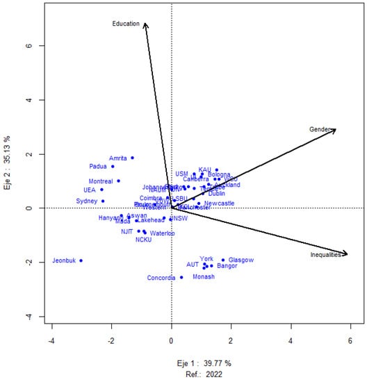 Close to Gender were 20 universities, six belonging to Australia (Sturt, Trobe, Canberra, VUW, WSU, and Western), five belonging to the UK (Bournemouth, KCL, LSBU, Newcastle, and Manchester), and universities from other countries such as USA (Tempe), Ireland (Dublin), Saudi Arabia (KAU), Malaysia (USM), New Zealand (Auckland), Italy (Bologna), Indonesia (IU) or South Africa (Johannesburg). However, in this plane, only six institutions were close to the variable related to social inequalities: AUT (New Zealand), Bangor (UK), Glasgow (UK), Concordia (Canada), York (Canada), and Monash (Australia).