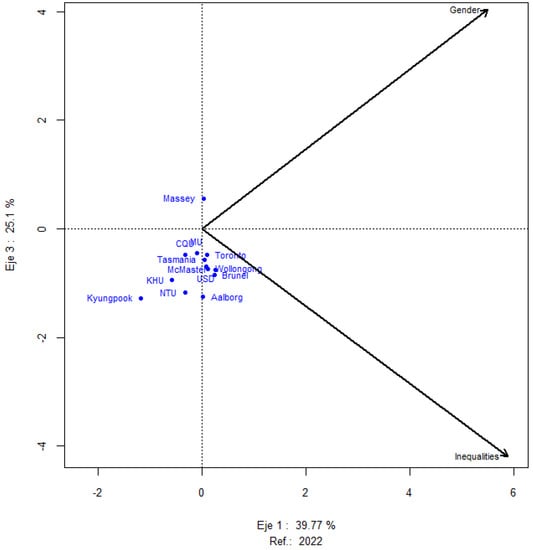 Figure 2 shows the biplot of the year 2020 for the 1–3 plane, which allowed us to characterize the remaining 13 universities that did not obtain a sufficient quality of representation in the 1–2 plane. The Inequalities variable characterized two Australian universities (Tasmania and Wollongong), two Canadian (McMaster and Toronto), two Danish (Aalborg and USD), and one British (Brunel). Also appearing on this plane was an institution in New Zealand characterized by the variable Gender (Massey) and five other centers in Australia, South Korea, and Taiwan not characterized by any variable (CQU, KHU, Kyungpook, MU, and NTU).