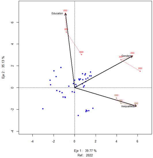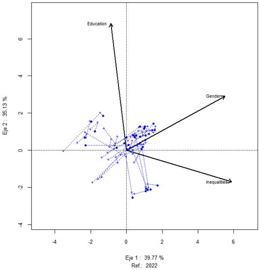 Figure 1 shows the HJ biplot for the data matrix for the year 2022, which provides as much knowledge of the reference as possible. A direct correlation was observed between Gender and Inequalities and between Gender and Education, which was stronger in the first case. However, Education and Inequalities correlated indirectly. The vectors of the three variables presented a similar length, thus showing similar variability.