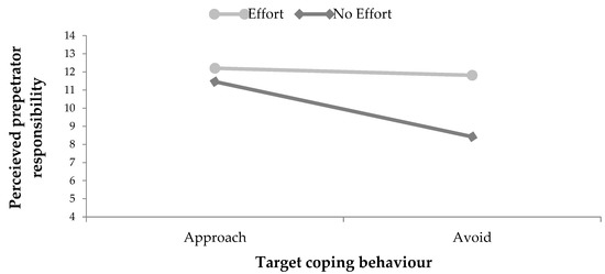 Estimated marginal means of the interaction of perpetrator response behaviour and target coping behaviour on perceived perpetrator responsibility.