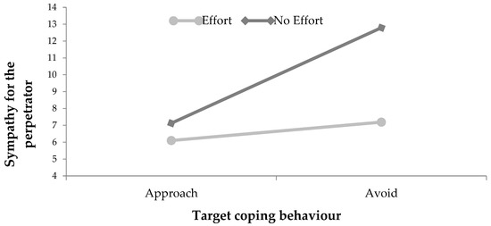Simple main effects were assessed to understand the effect response behaviour had on each level of coping behaviour. There was a simple main effect for perceived responsibility (see Figure 1). For the avoidance-coping behaviour, higher perpetrator effort led to more perceived responsibility for the perpetrator, F(1, 80) = 14.57, p < 0.001, partial η2 = 0.16, a statistically significant mean difference of 3.39, 95% CI [1.62, 5.16]. For the approach-coping condition, there was no difference between the response behaviour conditions, F(1, 80), p = 0.76, partial η2 = 0.01. There was also a simple main effect on sympathy for the perpetrator (see Figure 2). For the avoidance-coping condition, higher perpetrator effort led to lower sympathy for the perpetrator, F(1, 80) = 16.28, p < 0.001, partial η2 = 0.17, a statistically significant mean difference of 5.60, 95% CI [1.62, 5.16]. For the approach-coping condition, there was low sympathy toward the perpetrator, regardless of the effort response demonstrated F(1, 80) = 0.60, p = 0.44, partial η2 < 0.01.