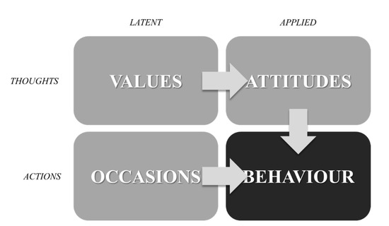 The illustration suggests that values are a latent motivating factor that manifests in behaviour through attitudes developed towards a given phenomenon. By identifying and measuring the impact of an individual’s values hierarchy on their attitudes and choices, we can explain and even predict behaviour. There are numerous pieces of research, including the most recent, that exhibit a different impact, including the direct impact of values on behaviour; however, they all refer to values being an underlying factor behind the actual actions and behaviour of the individual [23,24,25,26].