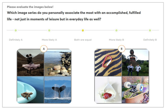 - Evaluation of collages of images.Respondents evaluated the likability of each of the collages of images by a question, “Which image series do you personally associate the most with an accomplished, fulfilled life—not just in moments of leisure but in everyday life as well?” and using a scale of “Like very much; Like; Rather like than dislike; Indifferent; Dislike; Dislike very much.” Respondents were asked to select at least two collages most associated with an accomplished life by showing them a subset of all collages, which they evaluated with scores “Like very much” and “Like” (see sample collages in Figure 2).