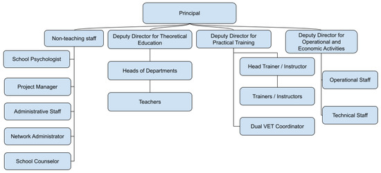 The most frequently applied organizational structure in vocational schools is displayed in Figure 1 and Figure 2.