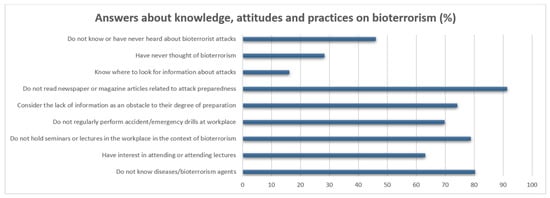 - Atakro, C.A.; Addo, S.B.; Aboagye, J.S.; Blay, A.A.; Amoa-Gyarteng, K.G.; Menlah, A.; Garti, I.; Agyare, D.F.; Junior, K.K.; Sarpong, L. Nurses’ and Medical Officers’ Knowledge, Attitude, and Preparedness Toward Potential Bioterrorism Attacks. SAGE Open Nurs. 2019, 5, 2377960819844378. [Google Scholar] [CrossRef]