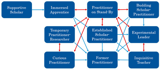 Horizontal relationships between the ten types of Scholar–Practitioners. Blue arrows indicate unidirectional or irreversible transitions. Red arrows indicate bidirectional or reversible transitions.