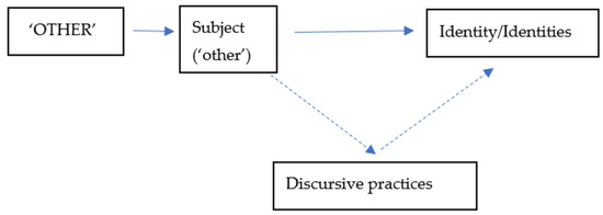 Hall did not wish to re-create, in Foucault’s terms, the “knowing subject” (p. 11), but rather to focus on discursive practices and how these may impact directly on identity/identities. In this sense, subjects’ identities may not be constructed by the “OTHER” alone, but also by the discursive practices in which they engage. This integrated view of identity formation is shown in Figure 1.