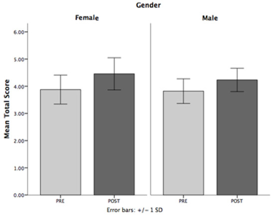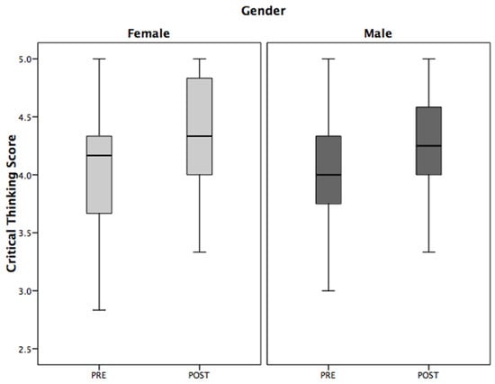 Regarding critical thinking, Figure 2 graphically shows the scores obtained in the e-Complexity instrument. For both the pre and post phases of this study, higher values were attained by females (pre = 4.06 points, SD = 0.53; post = 4.38 points, SD = 0.52) compared to males (pre = 4.03 points, SD = 0.53; post = 4.27 points, SD = 0.44). Likewise, higher scores were observed in the post phase compared to the pre phase for males and females with differences of 0.24 and 0.31, respectively.