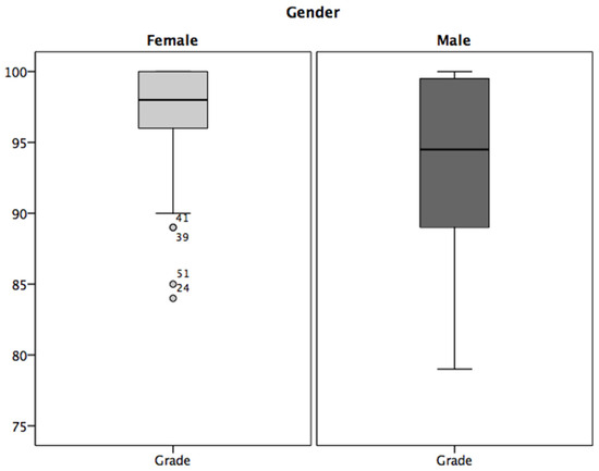 Finally, given that the participants in this study were enrolled in a well-being course, we asked: what was the academic performance of men and women enrolled in such a course? Is there any relationship between their performance in the well-being course in terms of numerical grade and their perceived critical thinking achievement? To answer these questions and respond to the main objective on the relationship between critical thinking and well-being, the numerical grades at the end of the course of the participants in this study were obtained. The grading scale was established from zero to one hundred points, with “100” being the maximum grade. Of the total sample, an average grade of 95.35 was obtained (SD = 5.43). A higher score was attained by women (96.52, SD = 4.55) than by men (93.55, SD = 6.27). Figure 3 graphically shows the means differentiated by gender. In the women’s group, some outliers were observed (circles in the figure). The numbers indicate the number of cases.