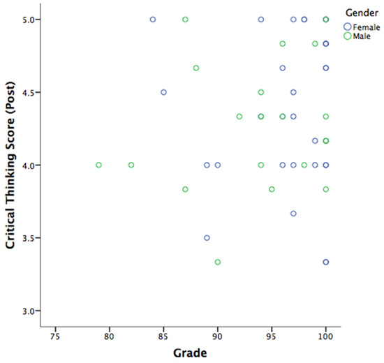 Next, Figure 4 shows the dispersion of the critical thinking score in the post phase as a function of the numerical scores obtained by the participants in this study. As can be seen, there is no trend of a linear relationship between the variables, which was confirmed with a Spearman correlation analysis that was not statistically significant (r = 0.116, p = 0.41). Despite this, a scatter plot is shown because the raw data are considered valuable to identify the performance of the participants according to their gender.