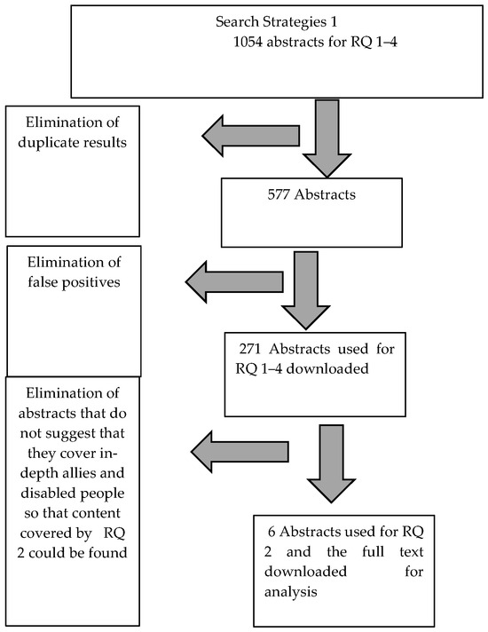 The aim of this study was to better understand the academic coverage of allyship and allies in relation to disabled people in general, and specifically the coverage of the challenges, stressors, and danger of burnout for the allies of disabled people. To fulfill this aim we first asked, using academic abstracts as sources: (1) Did abstracts indicate that the full texts were engaging in-depth with the issue of being an ally of disabled people and especially with the challenges, stressors, and danger of burnout experienced by allies of disabled people? For the abstracts that indicated a yes to research question 1, we then investigated the full texts asking: (2) Did the full texts cover challenges, barriers, and dangers including the stressors and danger of burnout linked to being an authentic ally of disabled people? Using the abstracts only, we furthermore asked: (3) Who were identified as allies in the abstracts? Additionally, we asked (4) What topics were mentioned in the abstracts where disabled people were seen in need of allies? For topics, we used as one strategy to search the academic literature (abstracts and full texts) for phrases where the very term is linked to disability rights and allies focusing on that topic. We asked: (5) Are phrases depicting the ability-based systemic discriminations that disabled people face, such as anti-ableism ally/allies/allyship, anti-disablism ally/allies/allyship, anti-disableist ally/allies/allyship, anti-disablist ally/allies/allyship, anti-ableist ally/allies/allyship, or anti-ablist ally/allies/allyship, used in the literature?