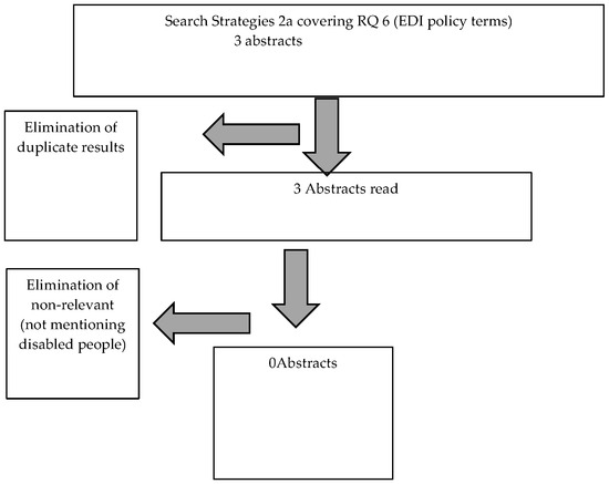 Flow chart of the selection of academic abstracts covering specifically RQ 6, relating to EDI policy frameworks used in the context of being allies of disabled people, for qualitative analysis.