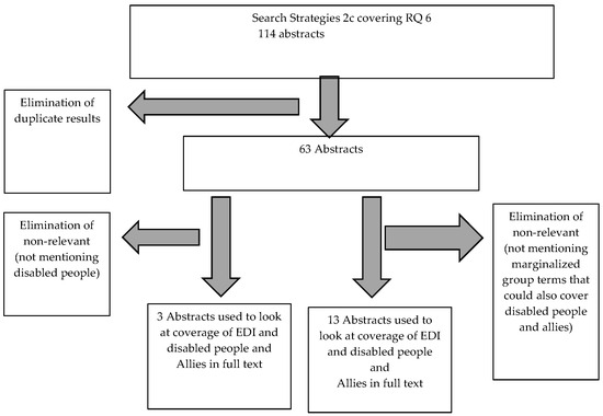 Given the result with strategies 2a and 2b, we moved to strategy 2c, which should also include the hits obtained with strategy 2b. Using strategy 2c generated sixty-three abstracts. Forty-five abstracts did not have content which would lead one to envision that the full texts would cover disabled people. Three abstracts mentioned disability terms but did not expand on disabled people, but the phrasing indicated that they at least were aware of disabled people within the EDI context, for example,