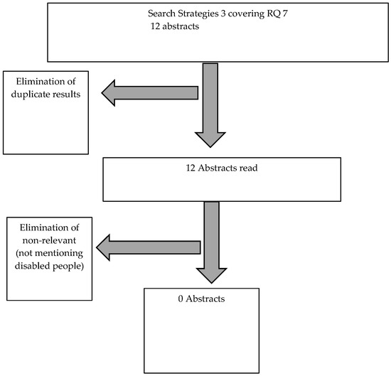 Flow chart of the selection of academic abstracts covering specifically RQ 7, relating to science and technology governance terms and allies of disabled people, for qualitative analysis.