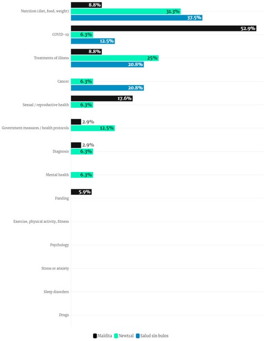 Throughout the study, there is a significant differentiation between the health fact-checking agenda of the generalist platforms (so-called throughout this study because they are dedicated to fact checking all types of topics, not only health) and that of the specialized platform (#SaludsinBulos). A greater number of hoaxes with a political perspective, i.e., relating the health issue in question to a secondary political interpretation, are found on generalist platforms than on specialized platforms. In the latter, health-related hoaxes are detected and combatted from a more informative perspective [], and therefore, this disinformation refers directly or indirectly to behaviors, habits, or elements that affect the health of society (without any other dimension or interpretation).
