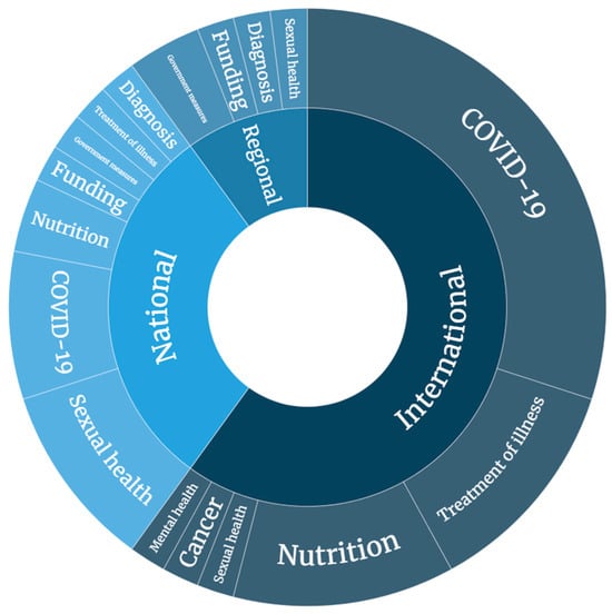 Combining the analysis of the scope of circulation and topic (Figure 3), it can be seen that, at the international level, COVID-19 continues to be the main topic, followed by hoaxes related to nutrition (food, diets, etc.). With respect to those with a national impact in Spain, the analysis showed that the breakdown of topics was more spread out, making sexual/reproductive health issues the most prevalent in relation to the political agenda.