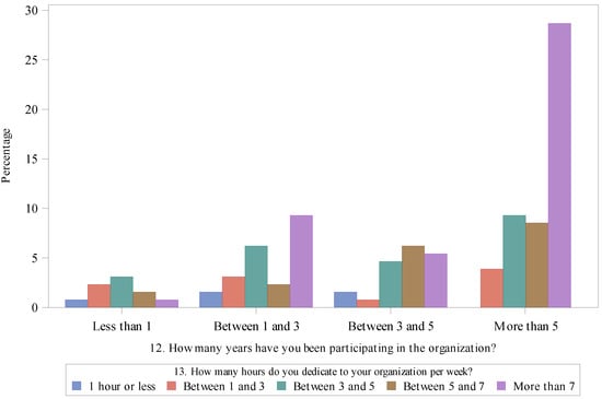 According to the analysis, respondents are long-term members of their organizations: 50.39% have been participating for 5 years or more, while only 8.53% have been participating for 1 year or less (see Table 2 and Table 3). The fact that 44.19% of respondents spend more than 7 h per week (only 3.88% participate 1 h per week or less) is also a reflection of the intensity of their participation, as we can clearly see in Figure 1. It is also important to note that 31.01% of respondents were engaged in more than one organization at the time they answered the questionnaire.