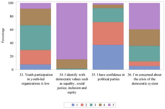 If we examine the factors that explain such attitudes—ranging from economic to political reasons—we immediately observe that youth unemployment [10] and political corruption [11] underlie this democratic disaffection [1]. We are exiting a pandemic, and we are suffering from wars in neighboring countries with a deep global impact. Satisfaction with the functioning of democratic political institutions drops in times of recession [12,13]. These issues give rise to a second research question: can this current disaffection be related to recent global crises? What is sure is that the public expression of this disaffection involves a high risk for democracy itself, as it appears to correspond to electoral support for populist parties that advocate for isolationism, the scapegoating of particular social or ethnic groups, and denouncing mainstream parties [10]. This may have a negative effect on youth democratic political identities as well, while concurrently dramatically eroding democracy [14]. Political polarization, the cultivation of a climate of animosity and the desire to dismantle democratic institutions are part of this democratic predicament [15]. This social behavior reveals a certain lack of democratic ideology among the youth, since the great appeal of these populist parties is based on their radical esthetics, simple reasoning and permanent counter-dependency [16].
