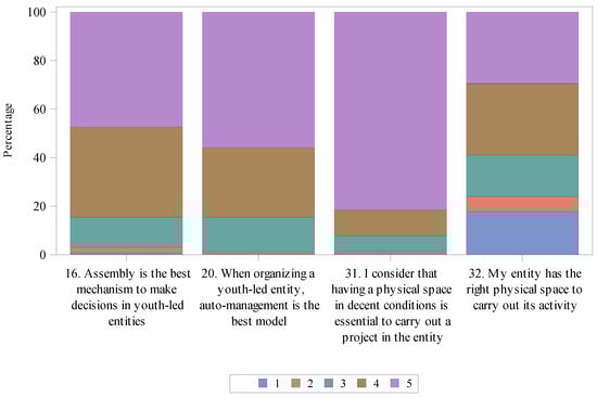 Results in this subscale give a very interesting point of view about respondents’ perception of their involvement in organizations and their influence in decision-making processes—two of the main motivations for young people to participate in youth organizations, according to the analysis of the open-ended questions in our questionnaire. As many as 79.8% expressed it was easy to become involved, while 82.2% felt very involved in the organization’s activities. A large majority (94.6%) declared that they participate in decision-making processes—none of them answered 1 in this item. Thus, 75.2% stated that they have influence in their organization’s regular decision-making areas.