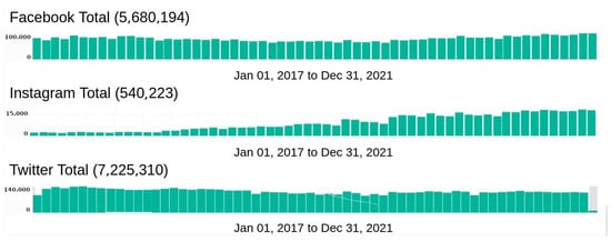 In order to capture the data, the Queltehue platform was developed to store the posts issued daily by 159 Chilean media outlets. This is a set of heterogeneous media in their political orientations (conservative and progressive), in their media origin (written or digital press, TV and radio) and with a distributed geographical character (from north to south of the country) [43]. Queltehue uses the Twitter API and the CrowdTangle service to download posts from Facebook and Instagram. These data are stored in a local database and are accessible through a friendly user interface that allows analyzing different characteristics of the posts. Moreover, it is a platform supported on ElasticSeach which enables the development of new corpus searches on any topic based on keywords. Quletehue can be defined as a unified data management platform (UDMP). In other words, it is a centralized IT system that works with large amounts of structured data (frequencies and values) and unstructured data (texts) from different sources (Facebook, Instagram and Twitter) to collect, integrate, manage and visualize them. This is how, finally, the IT infrastructure created managed to collect 5,680,194 informative posts on Facebook, 540,223 on Instagram and 7,225,310 on Twitter, with over 13 million total posts.