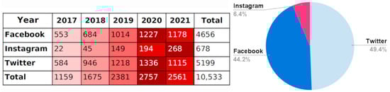 The first research question sought to reveal which social network is most frequently used by the media to address the issue of fake news. Figure 2 shows that 5199 posts were obtained on Twitter, 4656 informative posts on Facebook and 678 on Instagram. The intensity of red samples lower or higher publication frequency for each social networks.