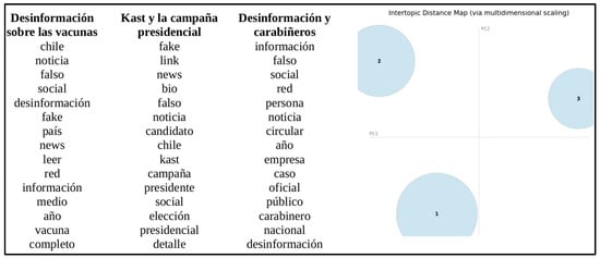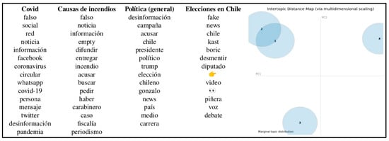 Four topics were obtained, which turned out to have significant equivalence (See Figure 3). As expected, the first topic responds to the disinformation regarding the coronavirus pandemic (2020 and 2021). Such a cluster shares common elements with the second topic that refers to the disinformation that circulated before the wildfire events, which were a highly significant event in the summer of 2017.