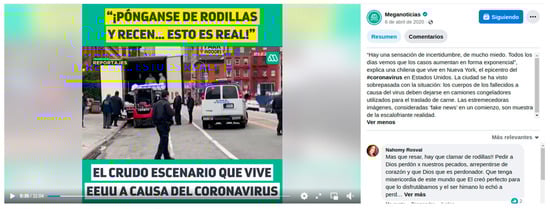 On Facebook, three out of 10 posts are concerned with rectifying (or announcing the rectification that takes place on the media outlet’s website) the facts on which the fake news is based. Specifically, the first post in order of interactivity clarifies that the alleged “fake images” associated with the storage of bodies in freezers resulting from the COVID-19 deaths in New York City are real (See Figure 6). This post includes a narrative video whose news values are negativity, superlativity and impact, in that they exaggerate morbid details and seek the emotional reaction of the audience, in such a way that the images play a function of evidence and sensation in relation to the written text. Thus, the ultimate goal of the news is not to inform about the development of the pandemic, but to give a lurid treatment that instills fear in the population.