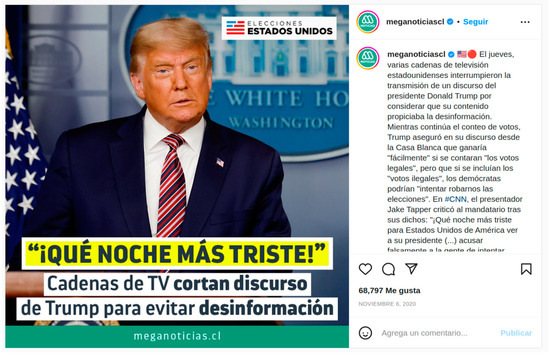 On Instagram, six out of 10 posts are dedicated to rectifying the facts behind the proliferation of fake news and disinformation. Of these, four are national in scope and two are international in scope. The breakdown indicates that two are miscellaneous in nature, two target the thematic area of technology and the remaining two deal with politics and society, respectively. On the one hand, three posts related to the pandemic stand out, which show the measures adopted by companies such as Youtube and Facebook to contain disinformation coming from anti-vaccine movements, as well as clarifications regarding the correct use of face masks. In these cases, conceptual images are used to illustrate the written content through logos and infographics, whose news values correspond to temporality and proximity criteria typical of the health contingency. On the other hand, two posts related to the local reality stand out: one about the presidential elections of 2021 and the other referring to police procedures in the context of the social outbreak. In both cases, the written content is illustrated by means of narrative images: one where the candidates Gabriel Boric and José Antonio Kast appear participating in the last televised debate, and the other of two Chilean police officers deployed in the middle of a demonstration. The first focuses on the news values of prominence and consonance, as it shows these two public figures from standardized visual patterns that enhance their rivalry; in this scenario, between the image and the written text, there is a relationship of co-contextualization, that is, of coherence and complementarity of meanings, since the headline “Boric gives a coup with drug test and neutralizes Kast with his fake news script” is portrayed in the reaction captured by the photograph. Unlike what is found on Facebook, Instagram posts are more regularly devoted to explaining data or background information aimed at counteracting the spread of misinformation and fake news, but it applies more to international than national issues. Thus, the post that obtained the most interactions on Instagram refers to the fact that American TV stations cut Donald Trump’s speech in the middle of the vote count (See Figure 7).