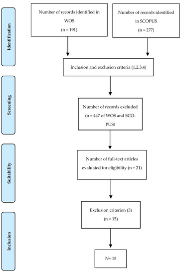 In a first phase, the search equation was established in both databases; The second consisted of applying the inclusion and exclusion criteria (1, 2, 3, 4). In order to apply the exclusion criterion (5) and once the sample was established, a detailed reading of the content of the 21 documents obtained was made, finally selecting a total of 15 articles (Table 3). The flowchart brings together the process carried out and the refinement of the scientific articles until the selection of the final sample (n = 15) (Figure 1).