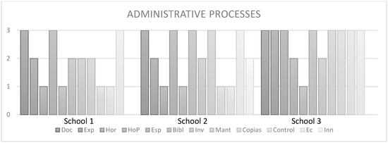This indicator is relevant because it directly correlates to the materials that will be analyzed later for the presence or absence of indicator concepts in the logic of the adherence analysis. It refers to 12 indicators, of which the first five allude to the planning and organization of the educational center, the next five to elements of durability in the management of the center (assets and infrastructure), and the last ones to innovation and economic management. The educational center that ranks the highest in terms of solid indicators is School 3, scoring a total of 29 points, versus 25 for School 2 and 21 for School 1. This indicates that the school management stabilization processes (key to the configuration of a school culture) favor the conditions of School 3. When analyzed in terms of percentage of the accumulated total, School 1 presents a coverage of 58%, School 2, 69%, and School 3, 81%, which makes the level of coverage particularly noticeable (Figure 4).