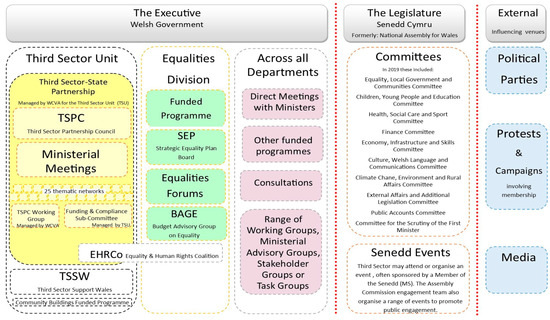 This article is concerned with the activities to achieve substantive representation in policy-making that are adopted by equalities organizations in their relationship with a sub-state government. The research question being addressed is: How have equalities organizations engaged with the institution of a nonprofit sector–government partnership to promote substantive representation? It is important to clarify what is meant by equalities organizations since this is not a universally recognized term. It refers to a particular set of nonprofit organizations that can represent the interests of different equalities groups. The use of the plural “equalities” is an established trend in equalities theory reflecting the multiple identity categories and different experiences of “diverse social groups” [1] (p. 2). For example, in the UK context, these categories are often understood to be age, disability, gender reassignment, “race”, religion or belief, sex, and sexual orientation because these categories are enshrined in legislation as the protected characteristics of the Equality Act (2010). Although it should be noted that there are legislative differences between the four UK nations that can shape understandings of equalities categories. For example, the Welsh Government has brought in the socioeconomic inequality as a duty under the Equality Act (2010). Beyond specific categories, intersectionality theory highlights the multitude of sub-categories that exist within and across identity categories [2,3]. Neither “equality” or “equalities” are ubiquitous terms. In North America, the composite term “diversity and inclusion” has increasing usage [4]. Although diversity has multifarious meanings and paradigms that overlap with representativeness and inclusion in complex and nuanced ways that are beyond the scope of this paper [4], where “diversity and inclusion” is concerned with multiple identities, particularly of underrepresented groups, it is comparable to this paper’s use of “equalities”. For the purposes of clarity, in this study, “equalities organizations” refers to the nonprofit organizations that represent the interests of constituents experiencing inequality due to age, disability, gender, gender identity, “race”, religion, sexual orientation, or socioeconomic factors and any intersections between and within these categories.