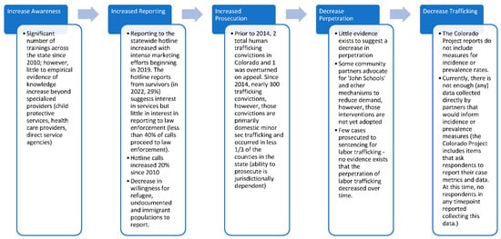 The aim of the Colorado Project, as it was initially conceived, was to overcome the boundedness of knowledge occurring in pockets across the state. The fundamental challenge to mobilizing a movement to measure social change is in decreasing the barriers that enhance knowledge transfer across geographic, sectoral, and provider boundaries. Boundaries to knowledge transfer tend to occur where specialization creates blockades [26]. Knowledge is sometimes localized, embedded, and invested in one particular way in a specific community or sector, and it may not be possible to transfer it to other communities [27]. These pockets are both locationally and professionally bound. For instance, in Colorado, the rural and frontier communities have stronger and more salient resource constraints, while the urban communities focus upon the concerns of the prevalence estimates of trafficking. Professional boundaries result from the specialized practices developed in law enforcement, prosecution, human services, shelters, private sectors (construction, agriculture, tourism, etc.), prevention, and numerous types of other industries that intersect in this movement.