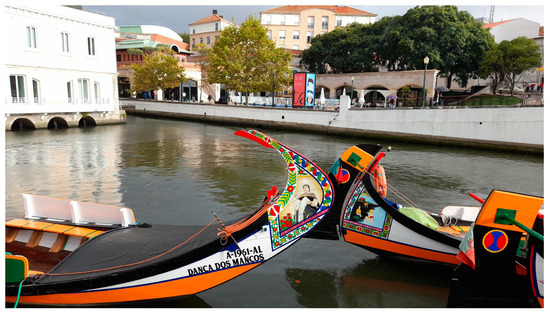 In the city center, symbolic elements of either an experienced or received past are present everywhere: from the traditional cobblestone pavements with nautical elements to the wall tile panels and façades depicting regional scenes or the maritime-inspired shapes of ovos moles, the local pastry delicacy [1,8]. Crossed by a network of canals, the city is mostly known for its picturesque boats (Figure 1). During the 19th and 20th centuries, these vessels—moliceiros—were used to harvest moliço, the algae and seaweed growing in the Ria, which, after being laid down on the floor to dry, were used as a fertilizer by local farmers. As moliço was progressively replaced by chemical fertilizers, the activity declined throughout the 20th century, with the more than 1350 boats registered in 1925 reduced to just 27 in 2019 [8]. Today, moliço is solely collected as a cultural reference.