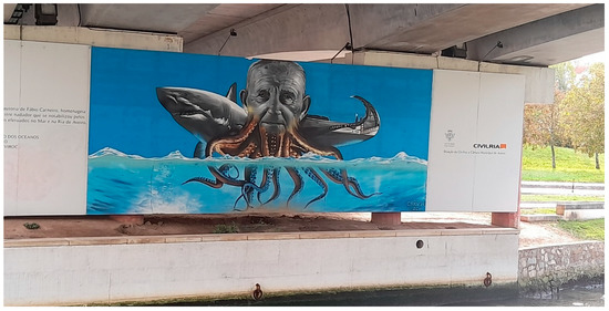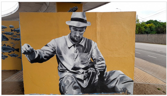 In Aveiro, in artworks created by António Conceição (Figure 3 and Figure 4), Fábio Carneiro (Figure 6, Figure 7 and Figure 8), Zooter (Figure 9) or Vihls (Figure 10), life and art meet to forge a dialogue between the past and the present. Their works constitute a repository of national and local symbols, values, traditions and ways of life, where many core elements of the community’s identity are celebrated and transmitted, not only to visitors but also to younger generations as well—thus supporting the line that creates the sense of continuity, as mentioned before. By integrating these elements into the urban landscape, each of their pieces allows for an experience of immersion into history, and the narratives they render may inspire reflection—which meets the cognitive interests of the modern tourist [9]—as well as raise awareness of the portrayed community members and their practices, values and beliefs.