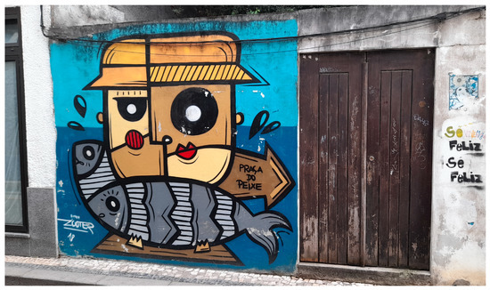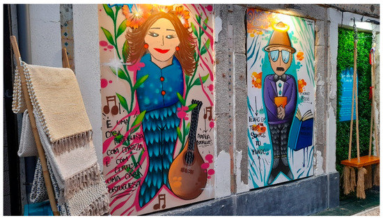 Even though there is not yet clear agreement on a conceptualization of street art as cultural heritage [77], one thing seems to be true: this art form has been socially recognized in its cultural and aesthetic potential by most media, municipalities, authorities, academia and institutions [58,77]. Moreover, as art takes over the streets, tangible and intangible elements of our culture are passed on from generation to generation, ensuring that a continuity line is drawn. Figure 5 illustrates one of the most recent examples of this in Aveiro, with the images of the national fado singer, Amália Rodrigues, and one of the most prominent Portuguese poets, Fernando Pessoa. These have been brought to the picturesque Fish Market Square, the place where tradition and modernity meet, and the neighborhood where, for many generations, students have chosen to gather at night.