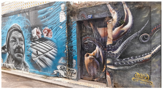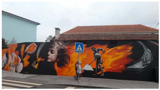 To attract investment and visitors, the tourism sector requires that cities and towns differentiate themselves and thus gain a competitive advantage. To achieve this goal, city branding has become a strategic tool that allows tourist destinations to differentiate from one another and boost their attractiveness and appeal [3,4,5,6,7]. In an increasingly volatile and competitive world, identity-enhancing approaches—i.e., strategies that identify and communicate the essence, that is, what is “authentic” and represents the core topics of a place and its locals—have become key in marketing and branding tourist actions, a strategy that has brought obvious advantages, with the cultural strategic offering being a central piece in the process [8]. In Aveiro, several street art projects have been assuming themselves as creative spaces where these identitary core elements are conveyed and celebrated [2], thus contributing to the overall goal of socioeconomic development that underlies tourist activities.