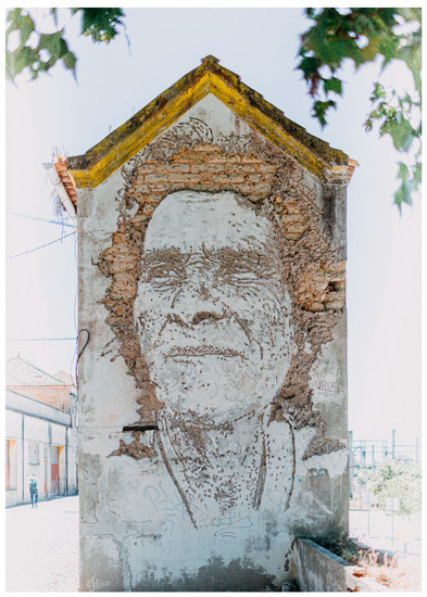 Another remarkable example of a tribute to a local figure is “Dona Florinda” (Figure 10), specially created for the 2017 Estarreja Urban Art Festival. Known worldwide for his impressive wall carvings [78], Alexandre Farto—aka Vihls—pays homage to a local woman of the municipality of Estarreja who, together with her husband, is the last producer to employ traditional farming methods in the cultivation of rice in the Ria fields, today protected as a National Ecological Reserve and National Agricultural Reserve. This work serves as a tribute to the past, as well as a reminder of the importance of preserving natural ecosystems.