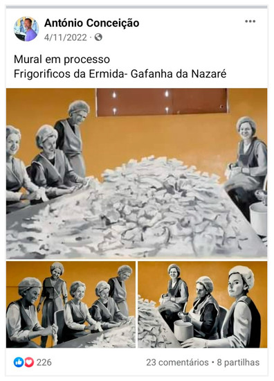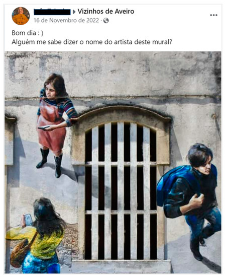 Gone are the days when Zooter’s first work (Figure 9) had to be fiercely defended by residents of the Fish Market neighborhood because authorities had declared it an illicit act and issued a fine [79]. Fast forward a few years, street art has been fully legitimized and transformed into an appreciated cultural product. The street art trail has not only gained an official route status, awarded by the National Tourism Office [2], but is also one of the most important components of Festival dos Canais [80], the multidisciplinary arts festival organized every July in Aveiro. Equally interesting is the case of AgitÁgueda [81], another summer arts festival organized by the neighboring city of Águeda, where streets are filled with an impressive number of urban art installations, transforming the city into a colorful open-air art gallery for three weeks. Also noteworthy is the enthusiastic support from the community: not only these festivals attract many local visitors, but every time a street art piece is mentioned on social media, either in community groups, on artists’ pages (Figure 11 and Figure 12) or by any local news media, the reception is generally very positive as well.